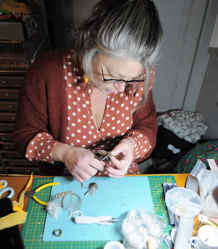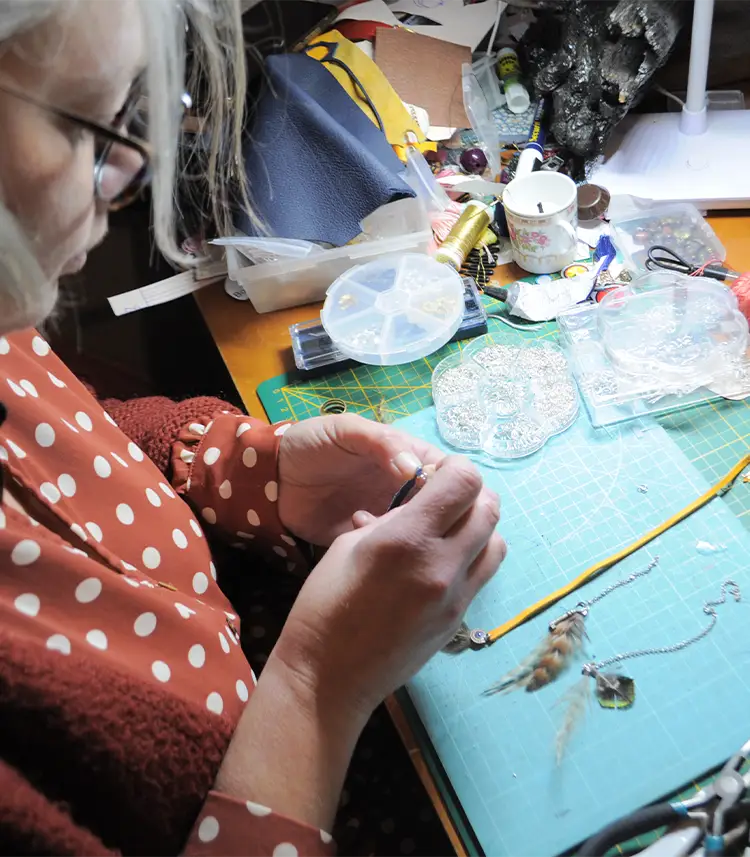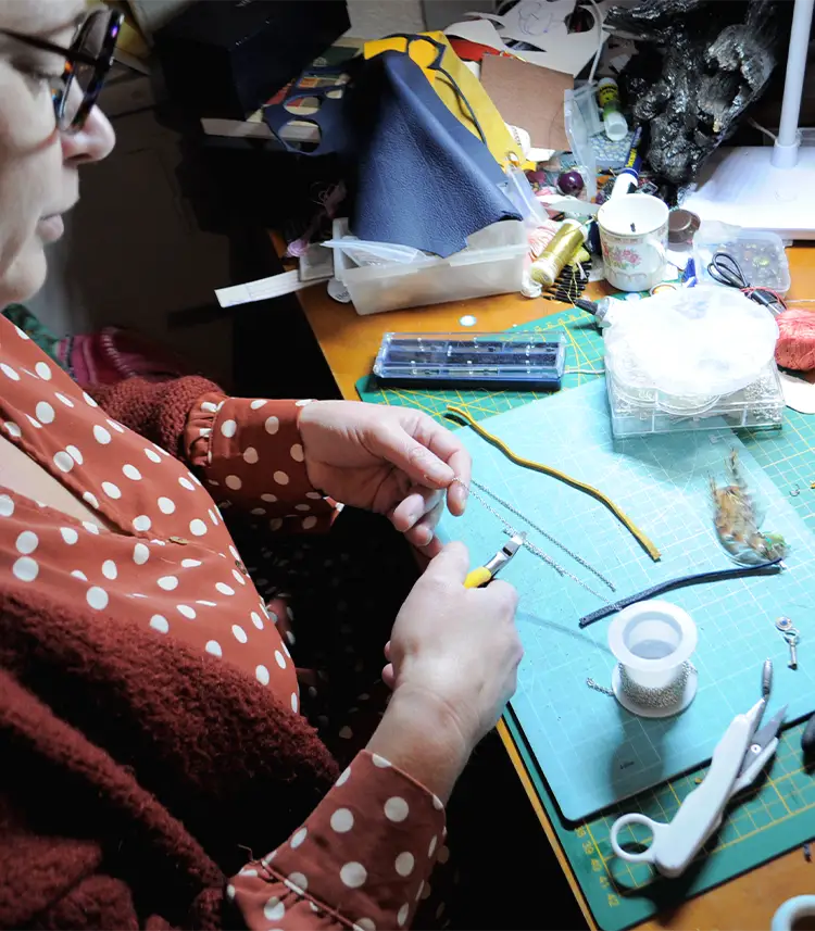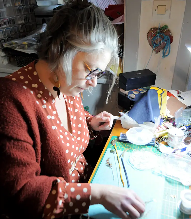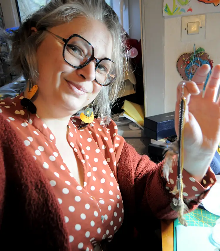 Je trouve mon inspiration dans les matériaux que je déniche : boutons anciens, perles oubliées, morceaux de cuir ou d’autres trésors récupérés au fil du temps.